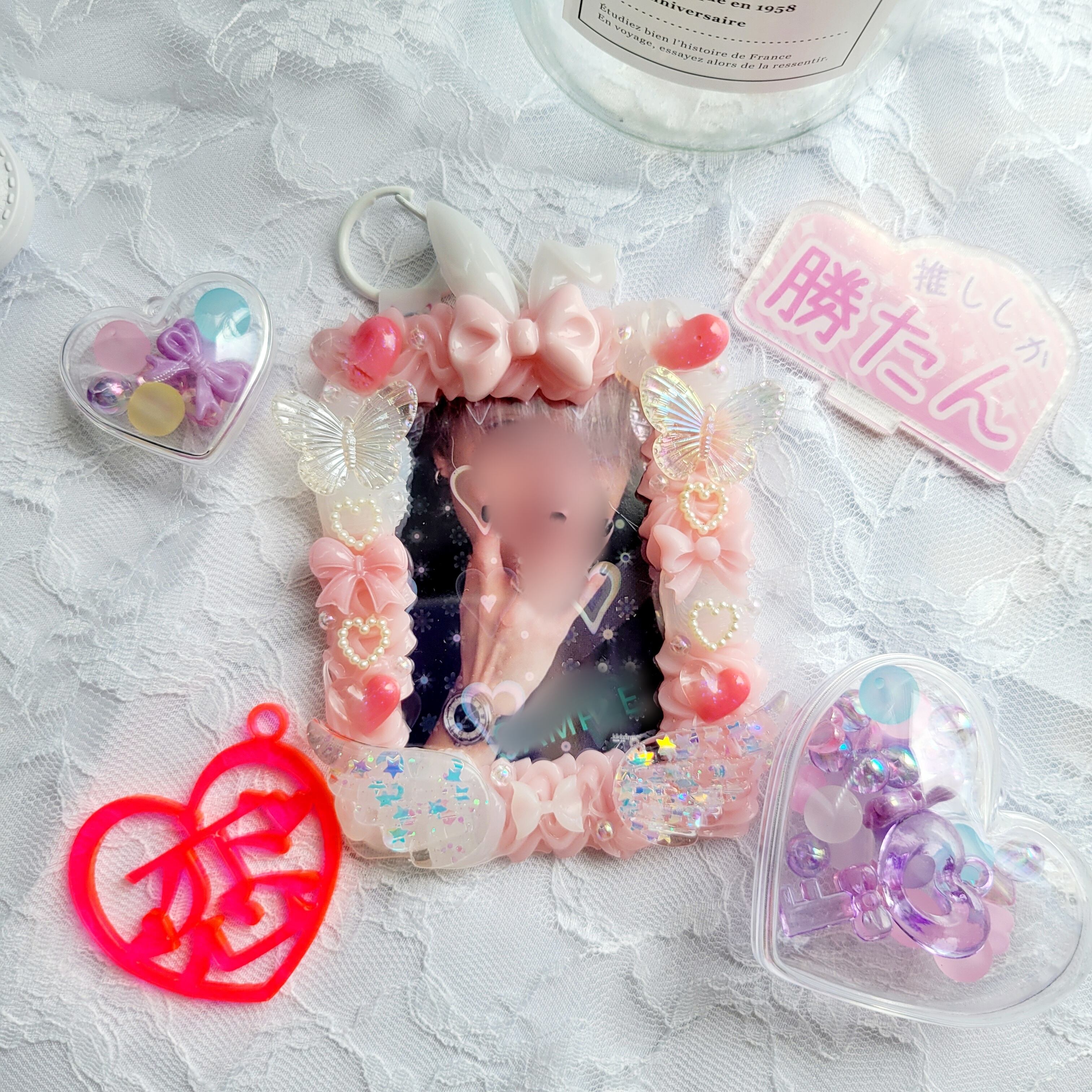 リボン、ハート、パールなどをたっぷりと使用し、大切な推しのトレカを華やかに演出♪