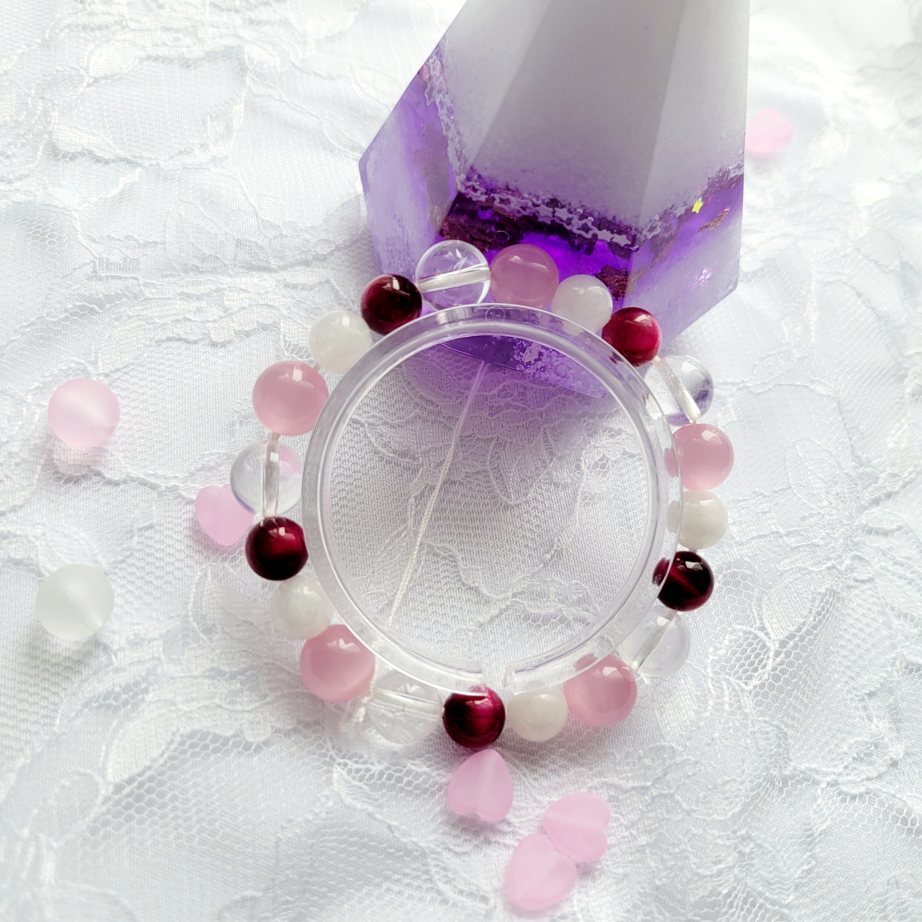 ピンク×ホワイトの組み合わせが大人かわいい、推し活にぴったりのブレスレットです